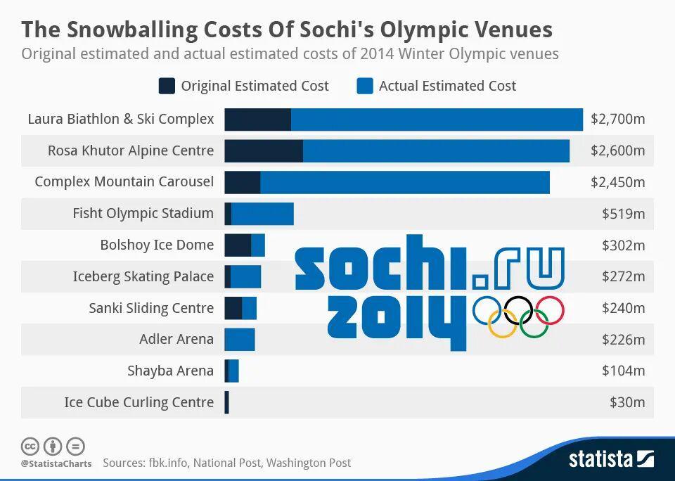 而对于主办国来说,可持续性的挑战不仅来自环境,也来自财政现实。一项牛津大学的研究显示,自1960年以来,奥运会总体成本呈指数增长,平均预算超支率高达172%。2014年的索契冬奥会更是以约510亿美元的支出创下纪录,成为奥运“巨型狂热”最具争议的象征。